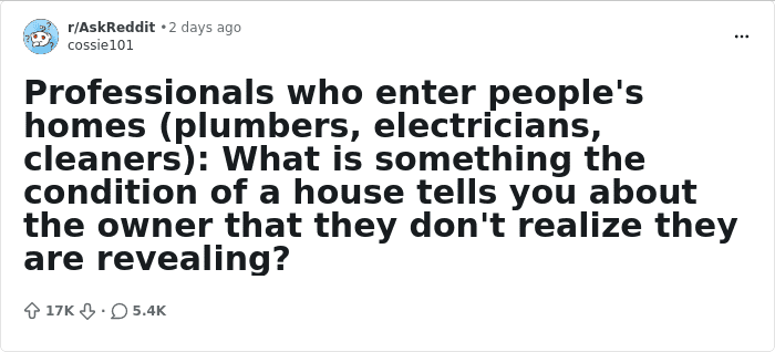 Home service professionals are experts at clocking these types of things. To them, the condition of a house may scream something even though it only whispers it to us regular folks. To find out what kinds of secrets people’s homes may hold, one netizen decided to ask these workers: “Professionals who enter people’s homes (plumbers, electricians, cleaners): What is something the condition of a house tells you about the owner that they don’t realize they are revealing?”