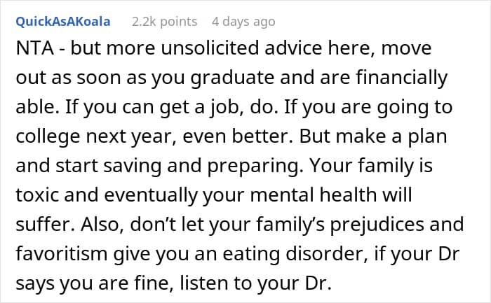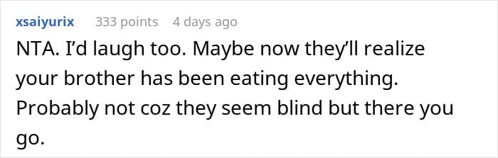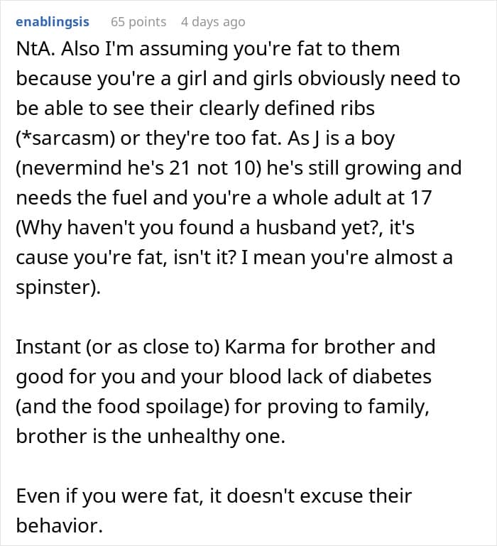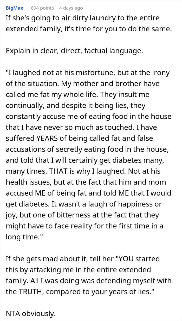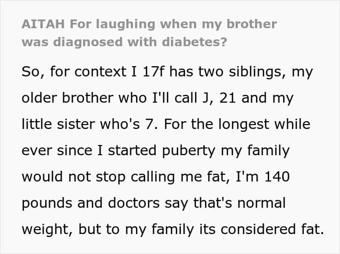 Eventually, she stopped defending herself and would remain quiet, but one day, her brother told their mother he felt sluggish and dehydrated and he was taken to the hospital. A doctor ordered bloodwork, and the results came back with her brother diagnosed with Type 2 diabetes. The shock was so intense, but the OP couldn’t help laughing at the irony.