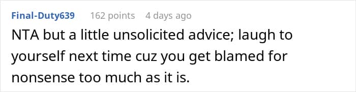 Netizens were firmly on the OP’s side, emphasizing that she wasn’t wrong for laughing and pointing out the clear irony of the situation. They agreed that her laughter wasn’t cruelty but a reaction to the poetic justice on display. They encouraged her to protect her mental and physical health, warning that her environment could become increasingly toxic.
