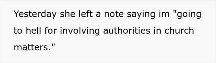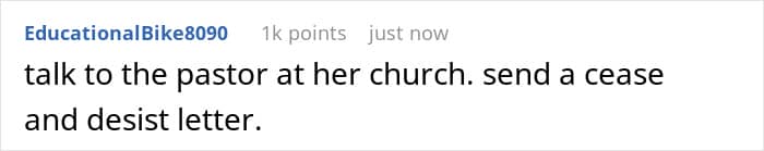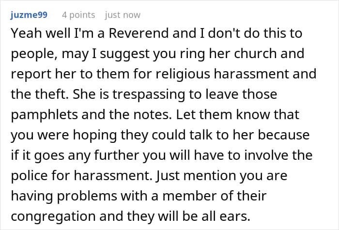 All of this considered, many people online suggested the OP to do something more to deal with her – whether it’s talking to her pastor or getting a restraining order – anything is good, as long as it makes her leave them alone. After all, her willingness to turn them to religion doesn’t seem to be healthy and feels even kind of dangerous.