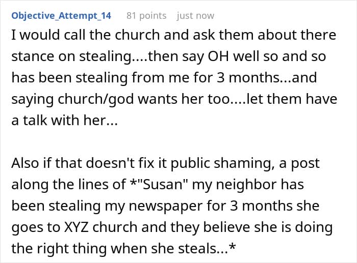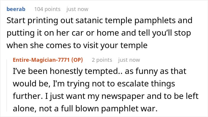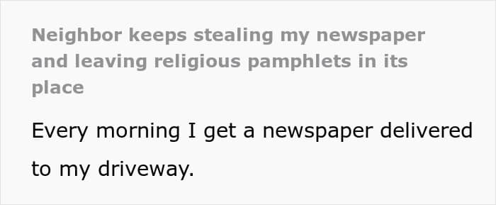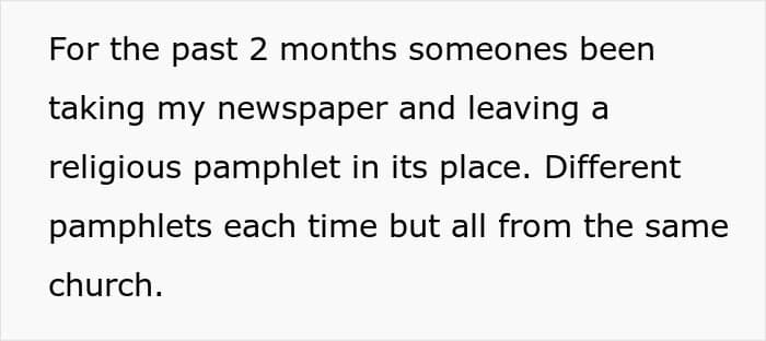 Every morning, the OP gets their newspapers delivered to his driveway. Yet, for the last 2 months, instead of the newspapers, they kept getting religious pamphlets from the same church. It was clear that someone was doing that on purpose, and it wasn’t the newspaper company.