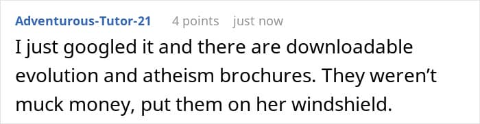 She tried explaining to them how she was “ministering to a lost soul” by doing God’s work, but they still gave her a warning about theft. And still, even this didn’t make her fully stop. She no longer touched the newspapers, but kept leaving the same pamphlets on the car windshield, one time with a note about how they’re “going to hell for involving authorities in church matters.”