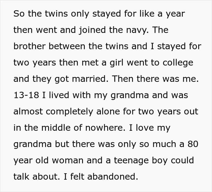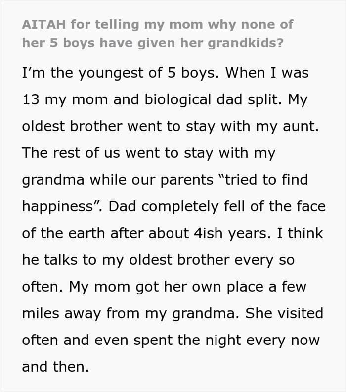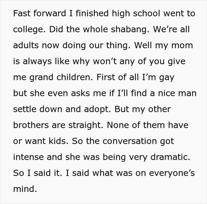 We asked the poster how his brothers reacted to his confrontation with their mom. The poster explained that his brothers didn’t really react to the whole incident. Plus, they don’t really have a relationship with each other and pretty much catch up on holidays.