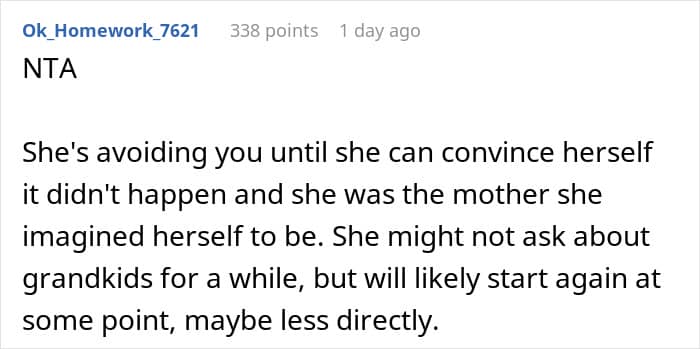 What do you think of this story? Was this confrontation overdue, or did our Redditor go too far? And what would you do if your parent kept pushing for grandkids after years of ignoring the past? Let us know in the comments below.