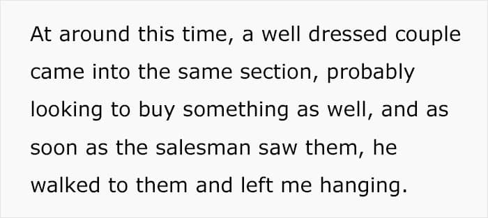 Naturally, the man was puzzled so he questioned the salesman, to which he replied that he was serving customers and that perhaps the author could wander around and look for something that he could actually afford. It completely infuriated the OP, so he went up to the customer service to repeat his enquiry once again. The person offered the help of the same guy that left the author for “wealthier” folks, but without any hesitation, the man declined.