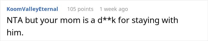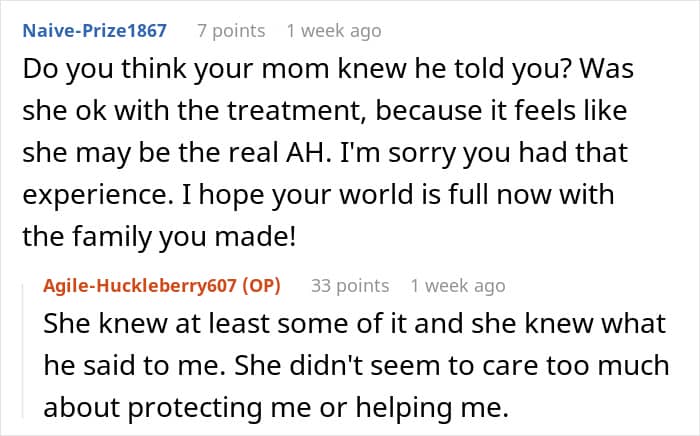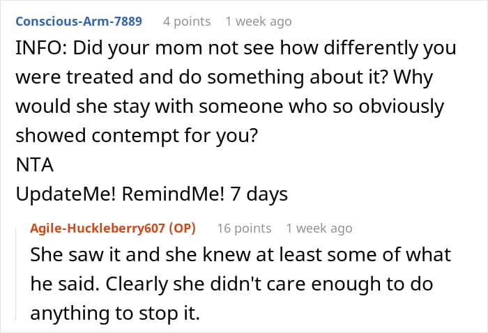 Folks were also concerned about whether her mother knew what her husband said to the poster or had an idea about the way he treated her. OP replied in the comments that her mom could see the way he treated her and his kids differently and also knew about some of the things he said to her but ignored it. This was quite horrifying to hear and netizens said that this was pure emotional neglect.