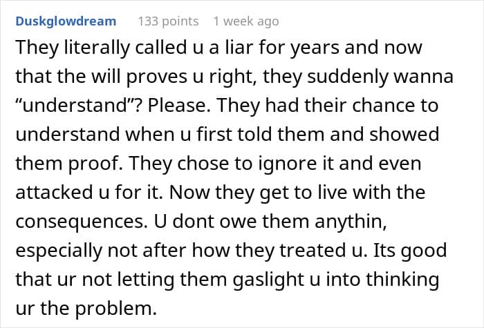 They only believed it when he passed away and left her nothing in the will, so they wanted to discuss it, but she refused after what they made her go through