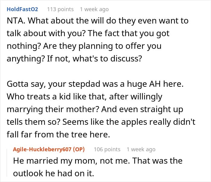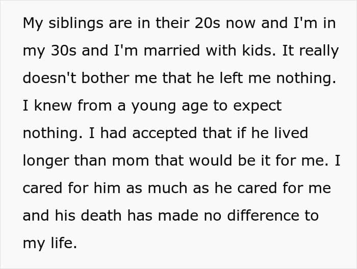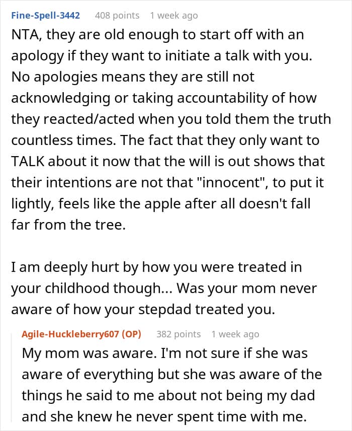 While the poster could be struggling with these things due to the way her mom and stepdad treated her, she also had to face the wrath of her half-siblings. Folks highlighted that it was only after the will that they approached her and that sounded like a big red flag. They even advised her to keep her distance from these people and she commented that she intended to do just that.