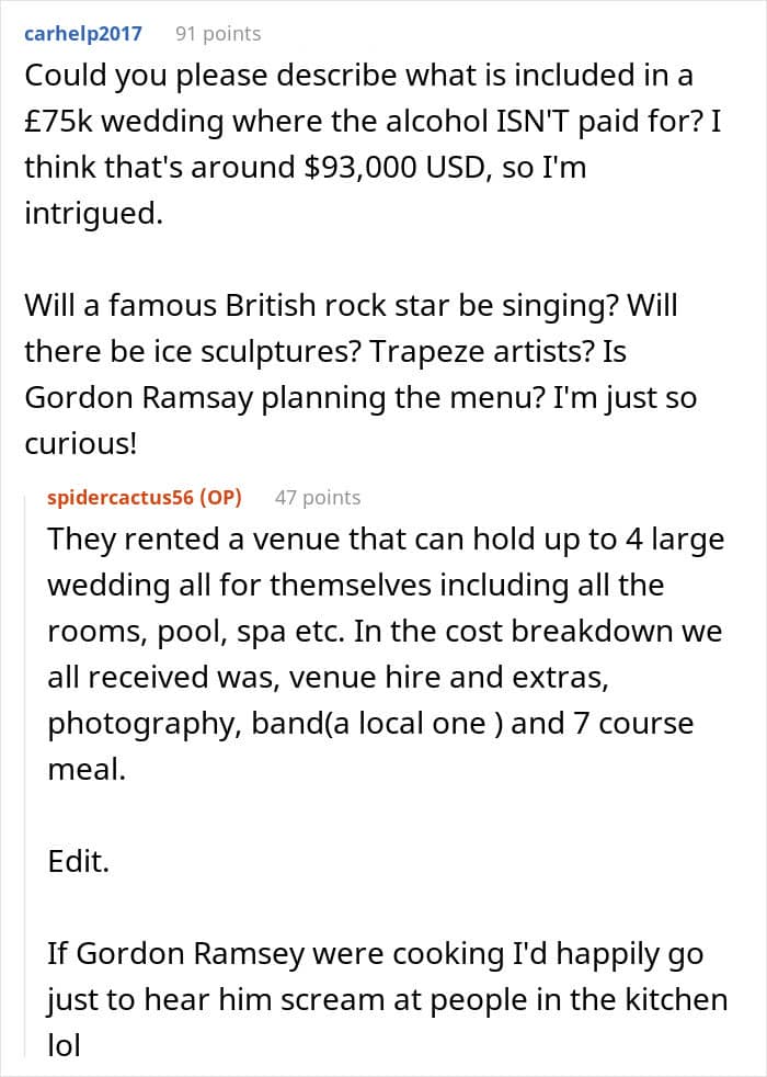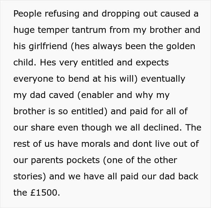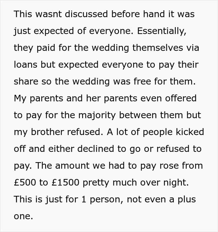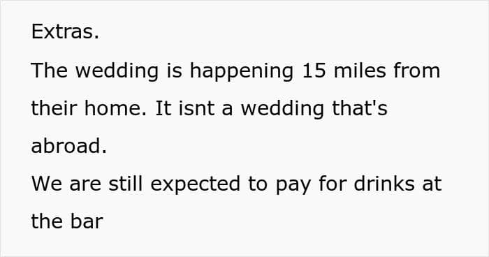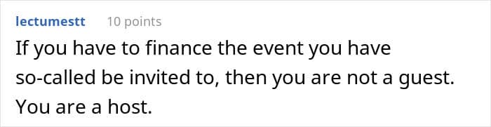 The last drop for the author was their upcoming wedding. “The thing that pissed a lot of people off was that if we wanted to go to their wedding, we had to pay our share of the wedding,” the Redditor shared and added, “this wasn’t discussed beforehand, it was just expected of everyone.”
