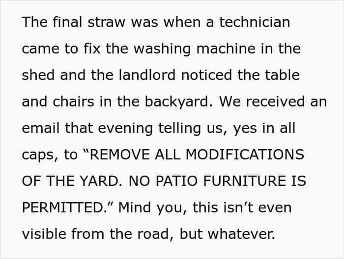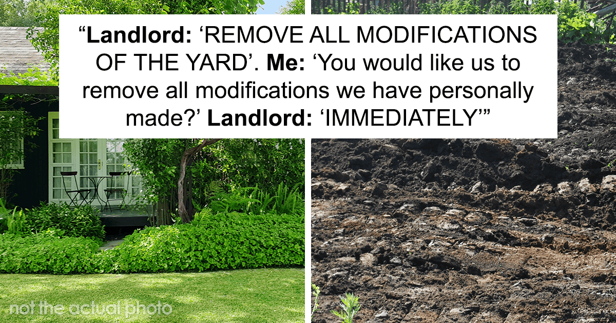 Things came to a head when he saw some tables and chairs in the yard. He flipped and demanded that all modifications to the yard be removed. So the OP double-checked if he really meant everything. He then maliciously complied with the request, all the while keeping a digital paper trail. No modifications meant that the tenants removed each and every upgrade they had made to the yard. Now, they had planned on leaving everything behind when they moved, but they decided to teach the landlord a lesson.
