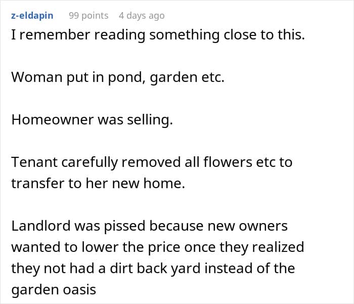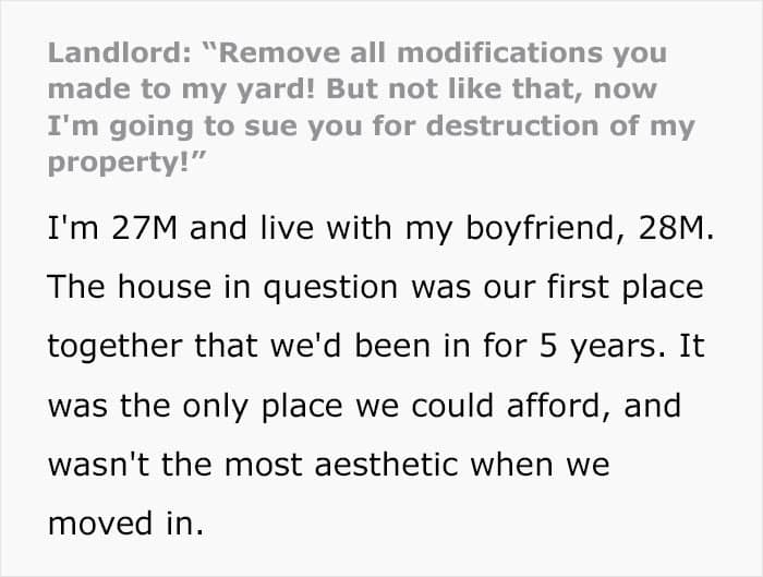 The OP explained how he and his boyfriend had spent the past half a decade improving their home after getting their landlord’s permission and going through all the right channels. That included turning the yard into something genuinely impressive, with flower beds, a pond, and a fountain. Tenants who genuinely care about the property and do their best to raise their value are any landlord’s dream. Or… so it would seem.