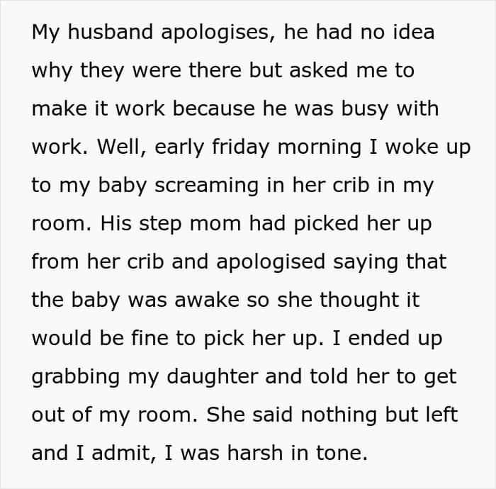 But somehow, our OP kept her cool and allowed them to crash in the guest room. But things escalated quickly, and by the next morning, the husband’s stepmom decided to channel her inner baby whisperer, without permission, of course.