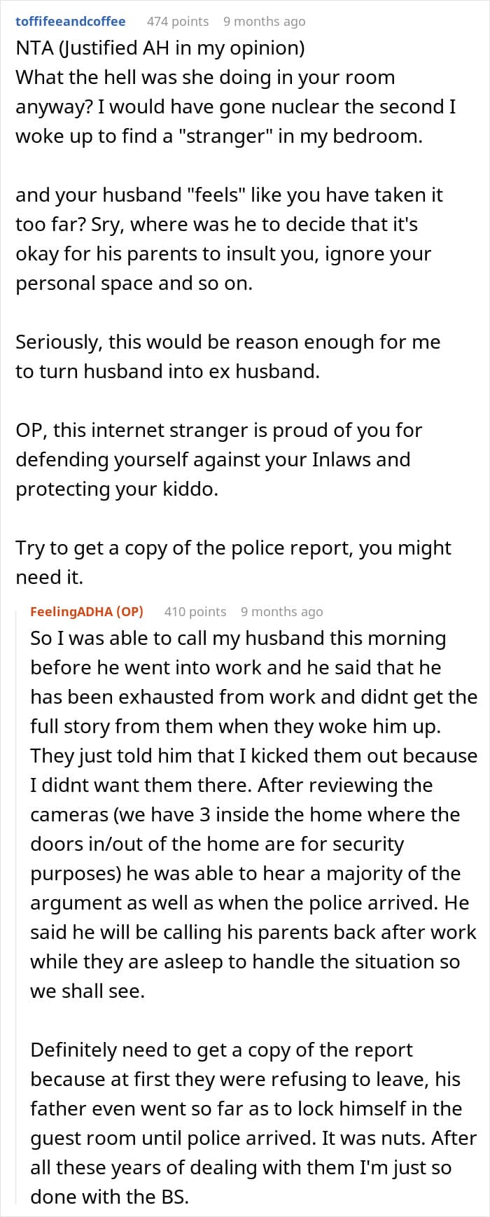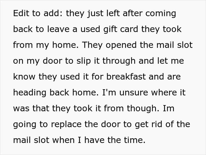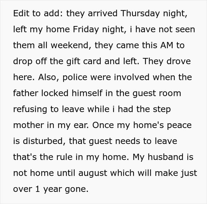 After that verbal grenade, the OP told her in-laws to pack their bags and get out. When they refused, the police had to intervene after the father-in-law barricaded himself in the guestroom, refusing to leave. And just when you thought it couldn’t get any pettier, the in-laws came back days later to return a used gift card they had taken from the OP’s house. Who even does that?