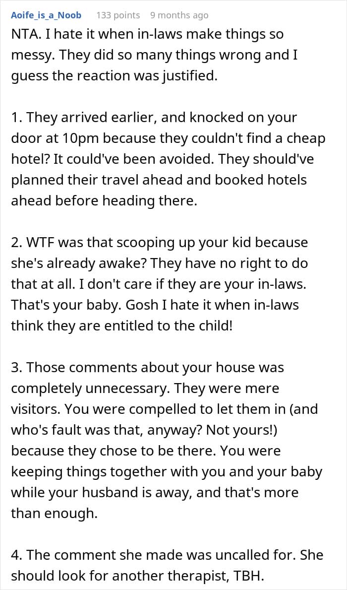 The OP (original poster) is a 27-year-old mom, juggling life with baby while her husband serves overseas. If dealing with a baby by herself wasn’t enough, she had to handle her in-laws on top of that, too. Despite an already tense history, her husband begged her to let his parents meet their granddaughter, promising they’d stay at a hotel.