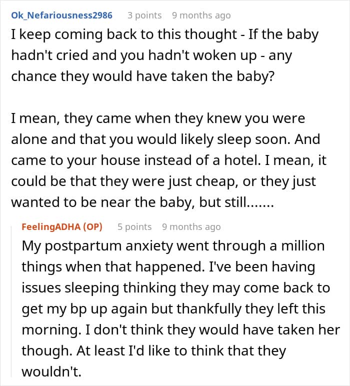 She snuck into the mom’s room, plucked the baby out of her crib, and somehow thought it was all okay. Predictably, this did not go over well. The OP, probably running on 3 hours of sleep and pure adrenaline, snapped while stepmom slinked away.