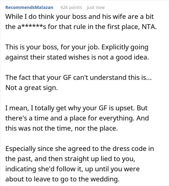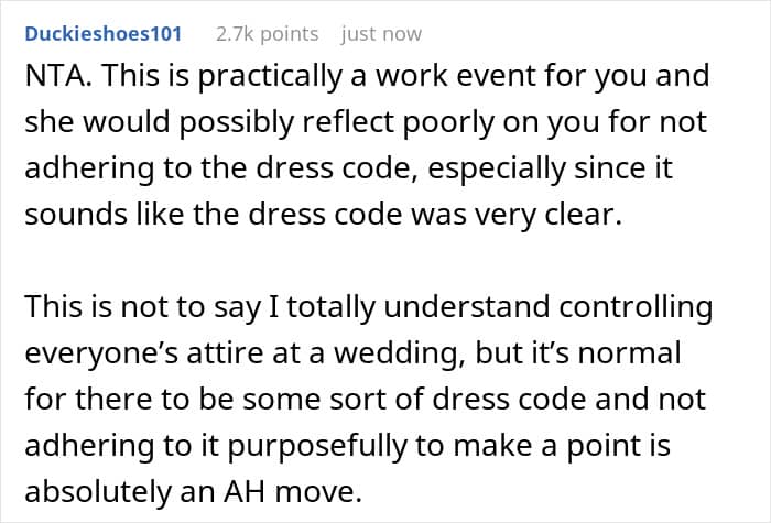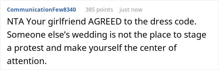 A redditor opened up about attending a wedding without his girlfriend because she wouldn’t follow the dress code