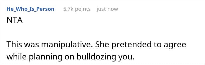 It doesn’t have to be a big deal to cause a big dispute. In the couple’s case, it was something as simple as choosing an outfit, however, the clothing was not the main reason. It was the broken agreement, not keeping up with what was discussed just before the sudden change. “It means that she is not willing to compromise and is willing to go back on her word. It means that I can not trust her and I know where I stand”, the OP shared.