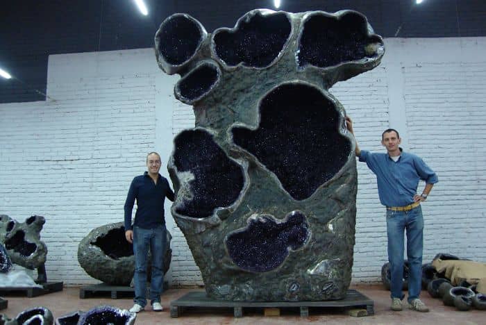 Geodes are hollow rocks that contain inward-facing crystals that are formed by numerous different processes, namely a slow flow of mineral material into pockets of air within rocks. One of the most renowned regions for amethyst mineralization and geode mining is the Artigas region of Uruguay. According to theGuinness Book of World Records, The largest amethyst geode weighs 13,000 kg (28,660 lb) and is 3 m (9 ft 10 in) long, 1.8 m (5 ft 10 in) wide and 2.2 m (7 ft 2 in) high. It is displayed in Shandong Tianyu Museum of Natural History (China) in Shandong, China.