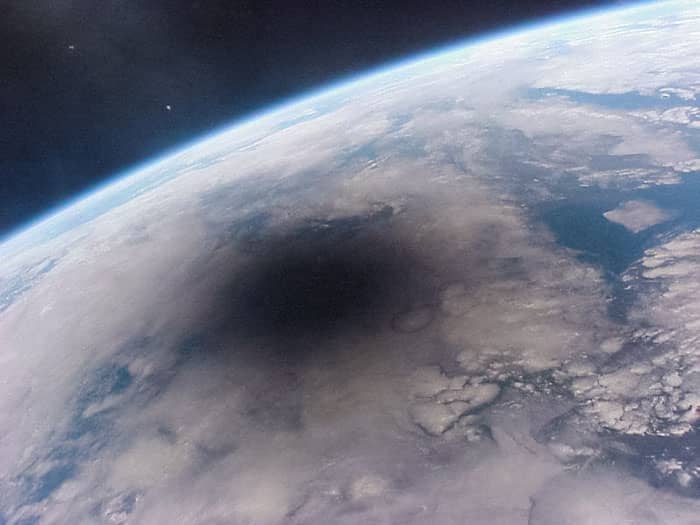 This photo was uploaded onto the Astronomy Picture of the Day and shows the shadow of theMoon darkening part of the Earth. It was taken by crew on the former Mir space station and it is estimated that theshadowmoved across theEarthat nearly 2000 kilometers per hour.