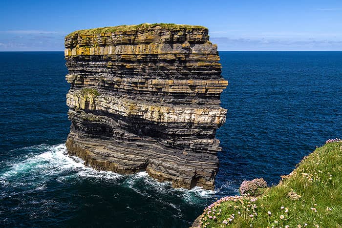 Living 50 metres off the north Mayo coast at Downpatrick Head sits the 45 metre high flat topped sea stack Dún Briste (the Broken Fort). Interestingly, this is considered to be a relatively new sea stack as it was only separated of the mainland Ireland in 1393 when monster seas severed it from County Mayo in an overnight storm. The summit of the stack is approximately 50 metres long and 15 metres across the centre. This flattopped stack contains the remains of the buildings where people were living on the night of the great storm.In1980 three scientists landed on the summit by helicopter and spent a couple of hours examining the remains of the buildings and plant life still surviving there. They discovered the remains of a building running across the centre of the headland with enough details left to say that both people and livestock lived together inside it.