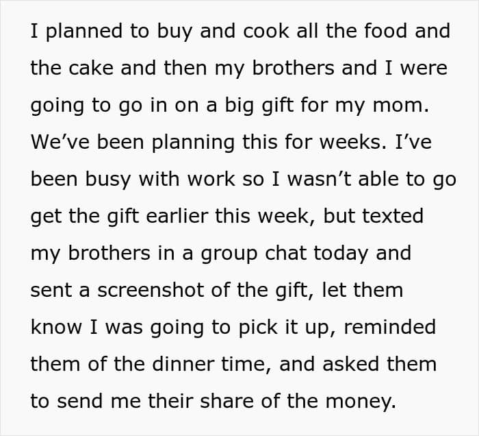 The original poster (OP) planned her mom’s birthday like a small wedding: family dinner at home, cake, and a big joint gift. Weeks of setup, group chats, reminders, the works. The only hitch? On the day money was due, her three brothers casually announced they were broke and somehow expected her to handle everything without blinking.