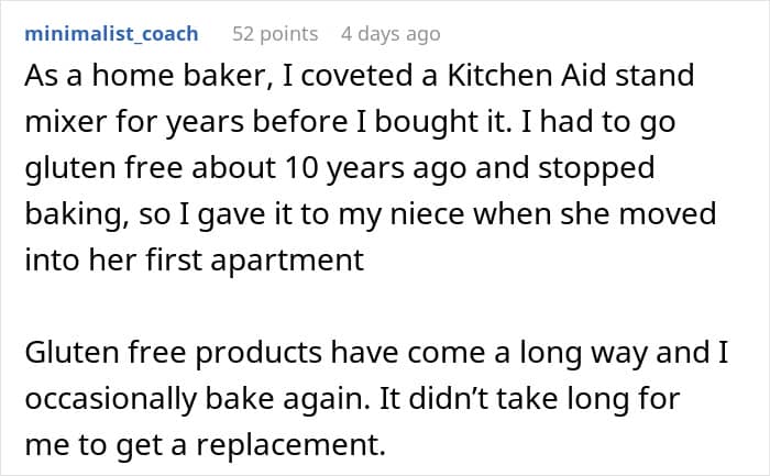 Well, the day turned out perfectly. OP’s mom shopped, dined, and nearly cartwheeled over her dream mixer. Her brothers eventually apologized, boundaries were set, and cake was eaten. Lesson learned? Sometimes being “the bad guy” just means finally drawing a line in the sand, even if you ruffle some family feathers while you’re at it.