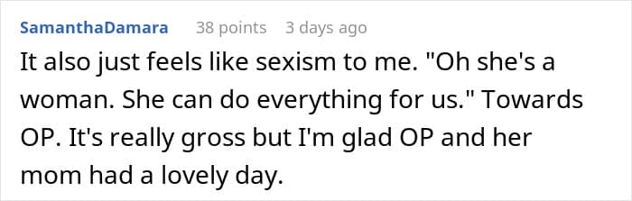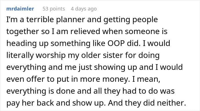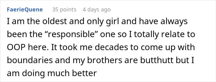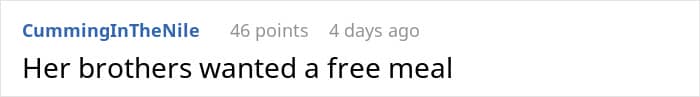 Normally, OP would shrug it off. Times are hard, wallets are empty, capitalism is a menace. But here’s the thing: she’s juggling a draining job, a daily side hustle, and sheer exhaustion, yet still budgeted carefully because their mom goes all-out for everyone. Her brothers, meanwhile, just planned to show up without actually showing up.