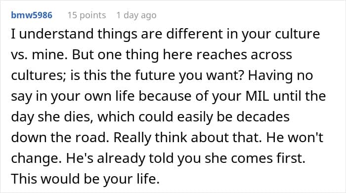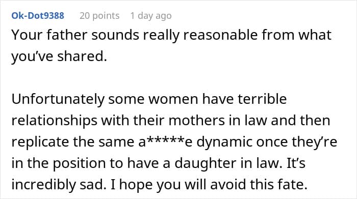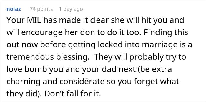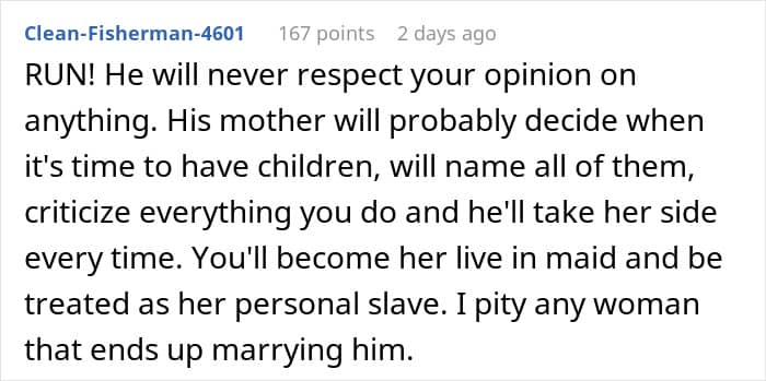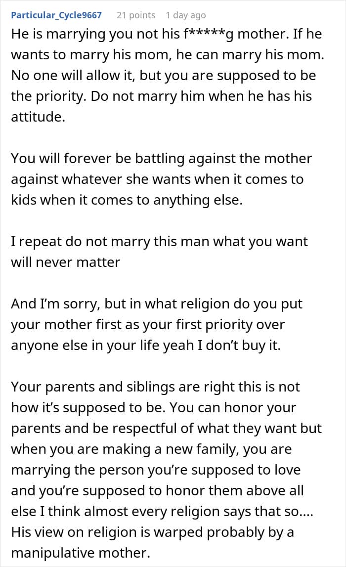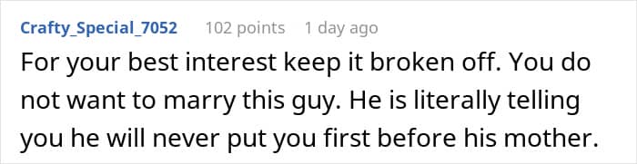 The connection between the woman’s (former) fiancé and his mom is undeniable. “Couples often come together with a feeling of newly discovered love, but the passionate and absorbing bond with a parent is the infant’s first experience of loving, and of being one person of a loving pair,” psychologist Terri Apter, Ph.D., says.