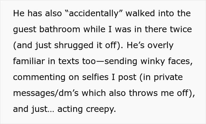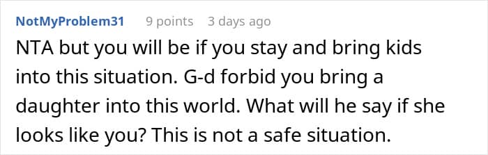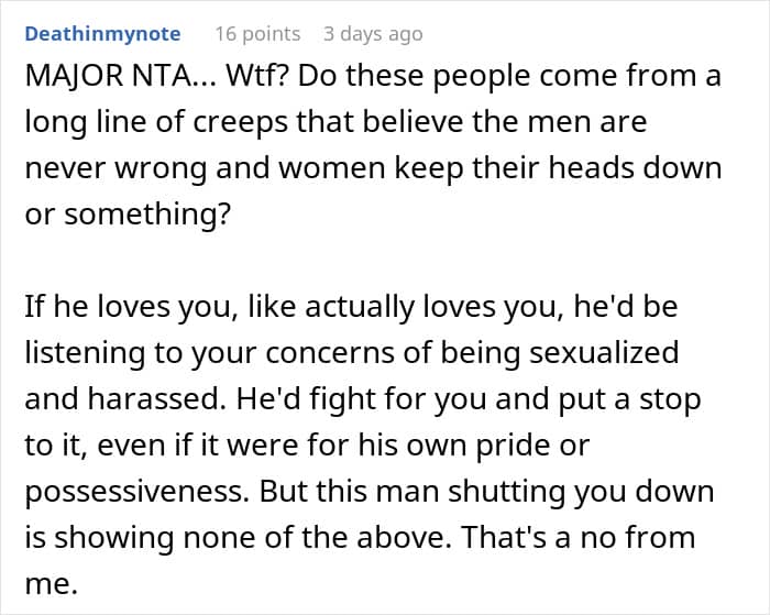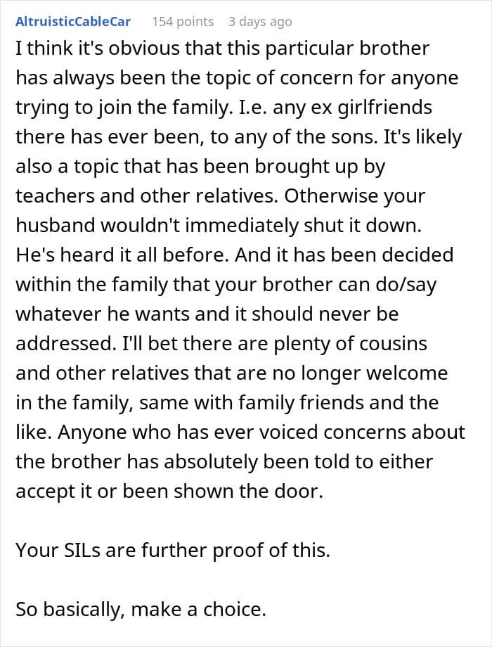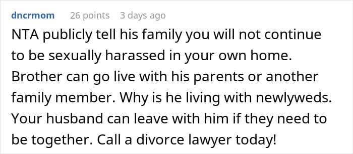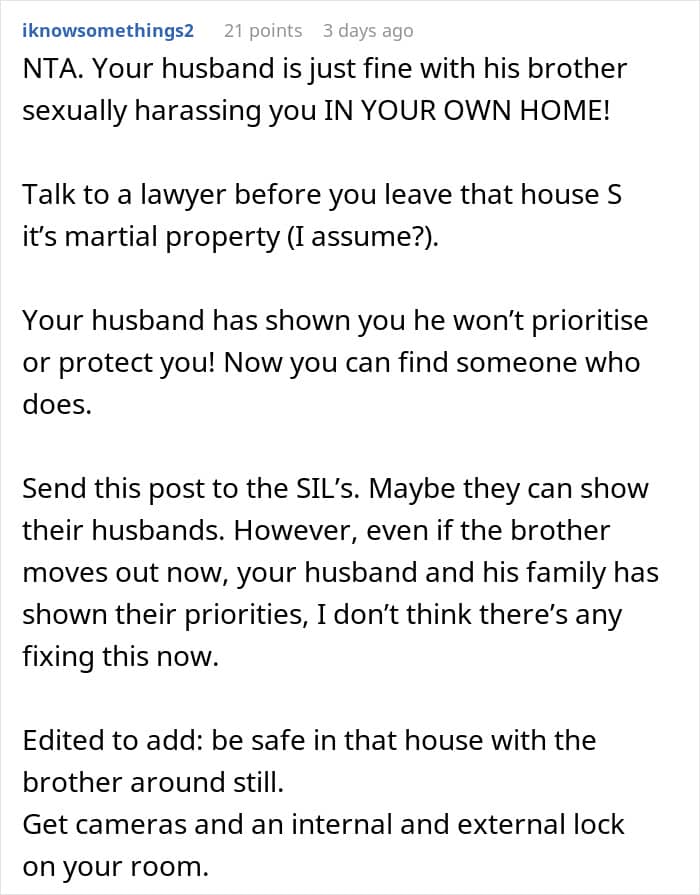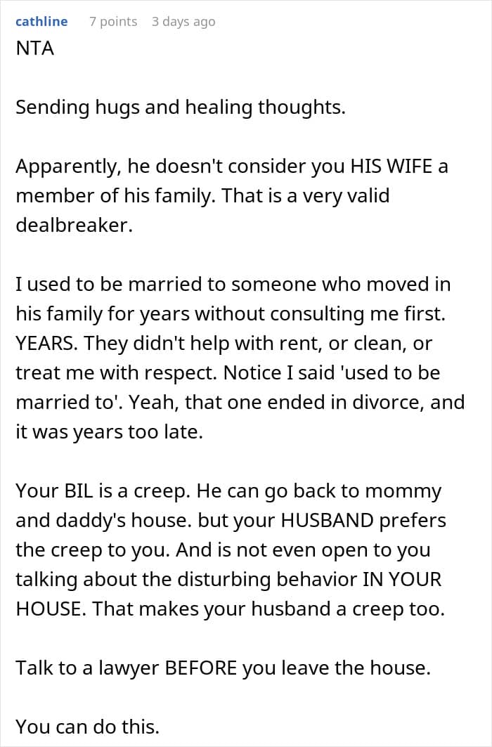 When a wife is uncomfortable around her in-laws, it is rarely about one comment or one visit. It is typically over time, through subtle moments of being ignored, criticized, or excluded. Those moments can leave her feeling like she’s not fully accepted, like she’s on trial or under judgment in her own marriage. In this story, the reality appears to be even worse, less “judgmental MIL” and more “creep brother.” If her husband ignores her feelings or won’t get in the middle, that sense of abandonment magnifies. Silence, in those instances, is betrayal. The very fact of failing to defend says much, suggesting that her comfort ranks second to getting along with his family.
