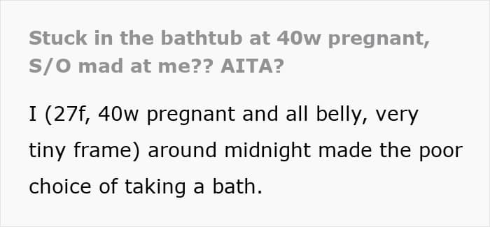 Forty weeks pregnant, today’s Original Poster (OP) decided a warm bath might ease her contractions. Instead, it spiraled into a panic-filled ordeal that tested her patience, her body, and, unfortunately, her relationship.