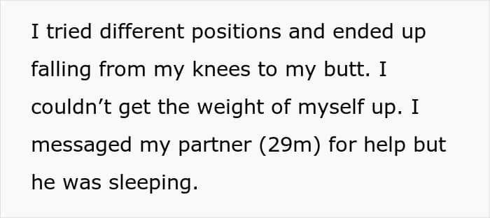 The OP, heavily pregnant and in pain from days of contractions, thought a bath might help her relax, but when it came time to get out, her tiny frame and all-belly pregnancy worked against her. No matter how she twisted or shifted, she couldn’t hoist herself up. The water had drained out, and she ended up painfully stuck at the bottom of the tub.
