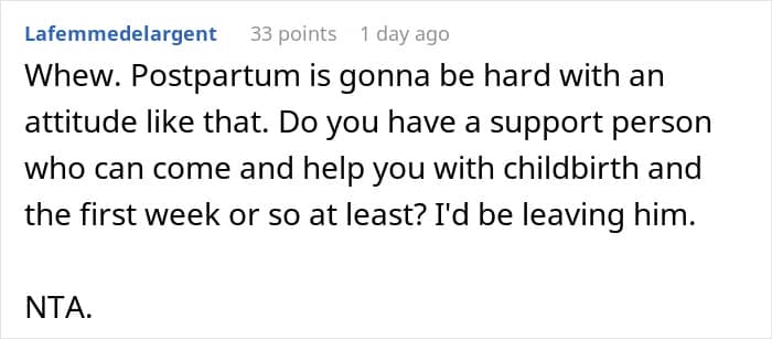 Netizens expressed shock and concern over the partner’s behavior, with many highlighting how his reaction was inappropriate given the circumstances. They labeled him as inconsiderate and a red flag, warning the OP about potential future issues, especially once a newborn arrives.