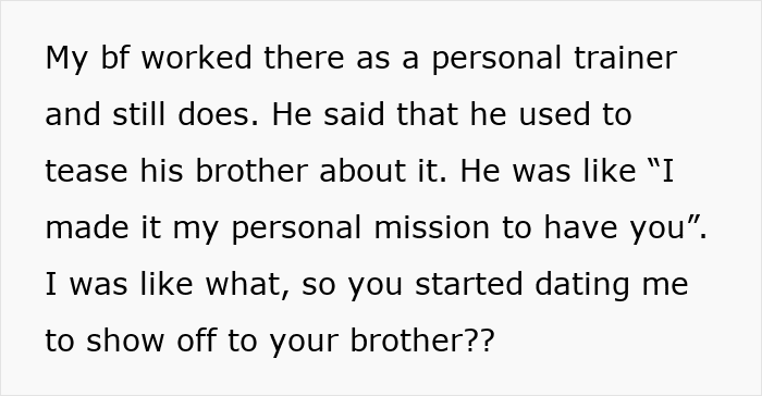Confused, she asked him what he meant, and he revealed with a grin that he only pursued her because his brother had a crush on her, and then laughed about making it his “mission” to get her. For context, the OP met her boyfriend and his brother at the gym where he works as a personal trainer. However, the boyfriend admitted that he knew his brother had a crush on her.