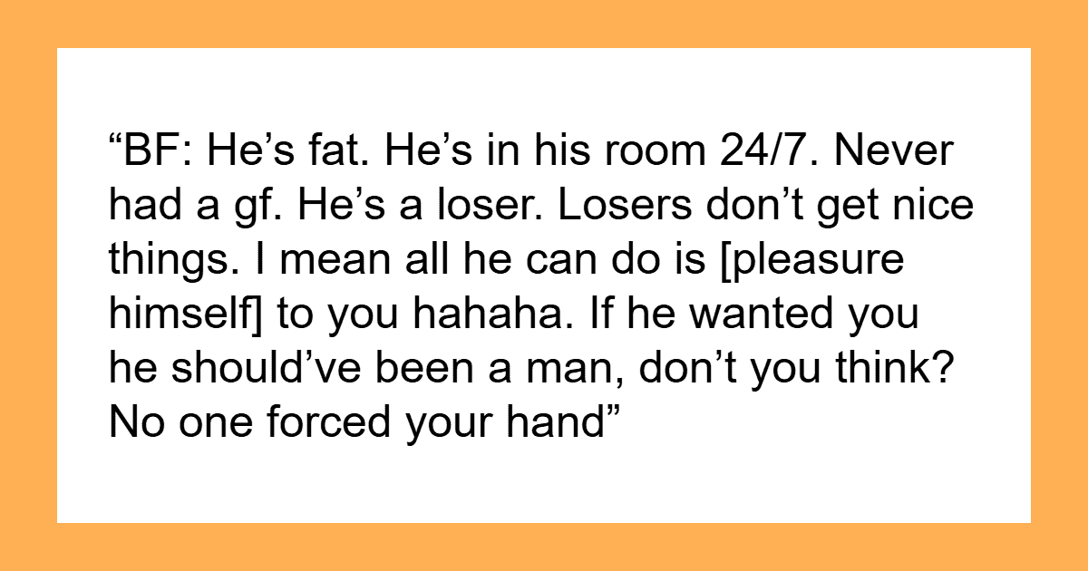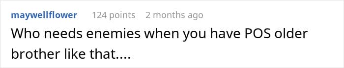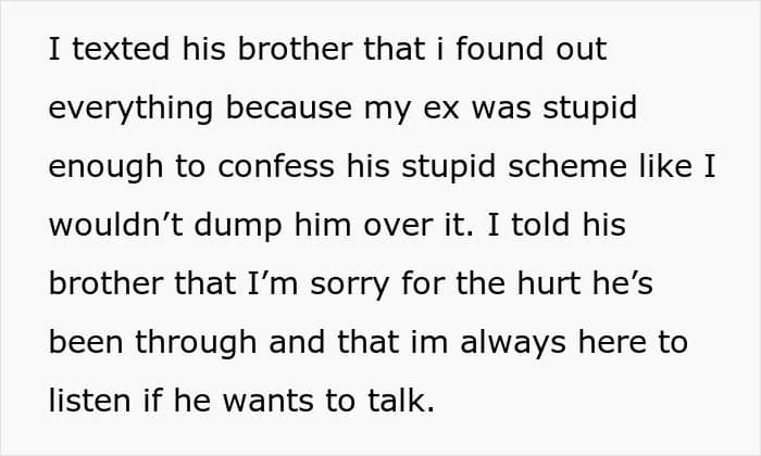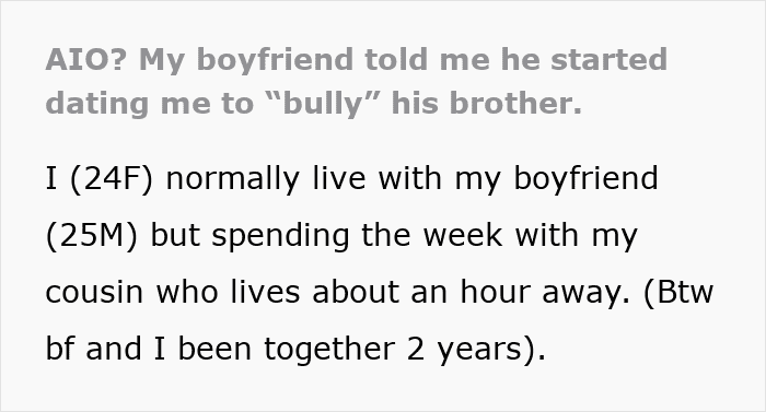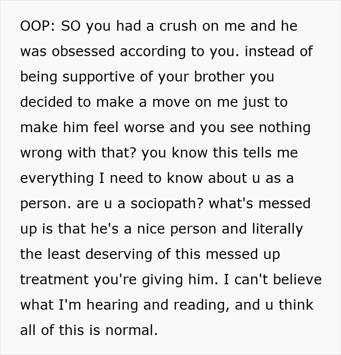The boyfriend, though, saw that as an opportunity to one-up him. He admitted he didn’t even like her attitude at first, but still viewed getting with her as a fun challenge to tease his brother about. The OP was petrified to hear that, and when she pointed out how weird it was, he told her to calm down and that it wasn’t “a big deal.”