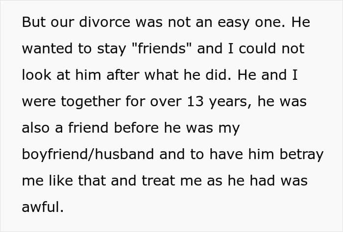 After more than 13 years together, including years of friendship before marriage, the OP’s world collapsed when she discovered her husband was having an affair. In fact, it was worse that the affair partner was pregnant around the time the truth came out. Their divorce was anything but peaceful, with him pushing to stay “friends” while she struggled just to process the hurt.