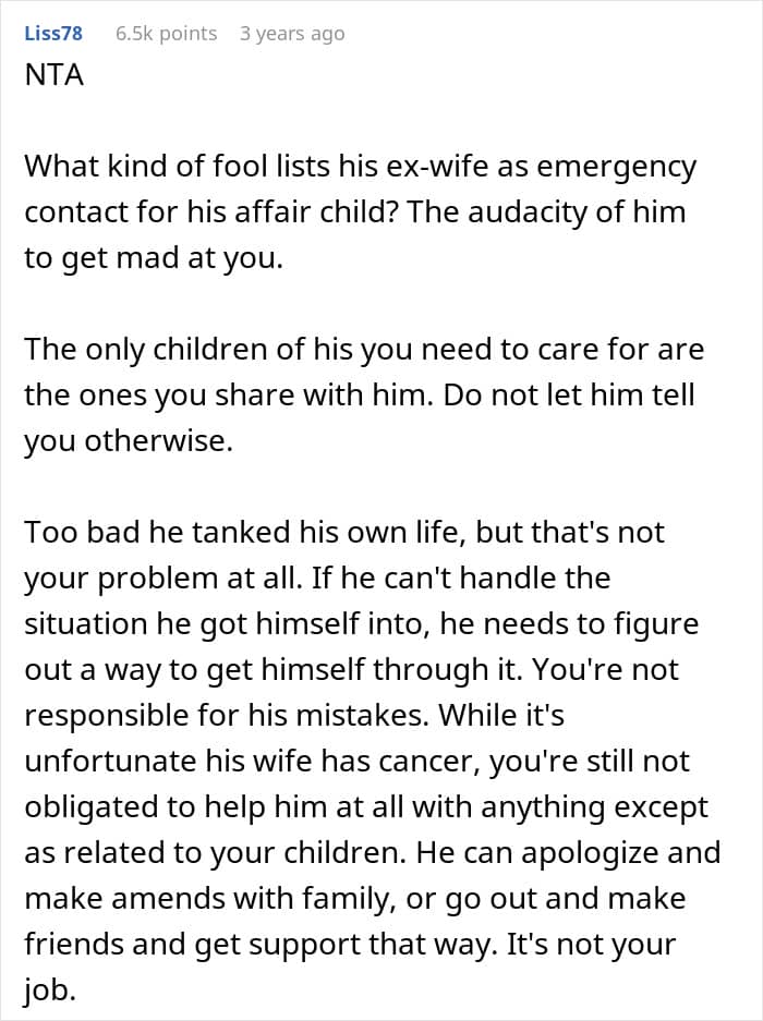 Netizens supported the OP, emphasizing that she is not responsible for her ex-husband’s new family. They also highlighted that listing her as an emergency contact and expecting her to step in was manipulative and inappropriate. What do you think about this situation? Do you think a parent is ever obligated to help an ex’s new family during a crisis? We would love to know your thoughts!
