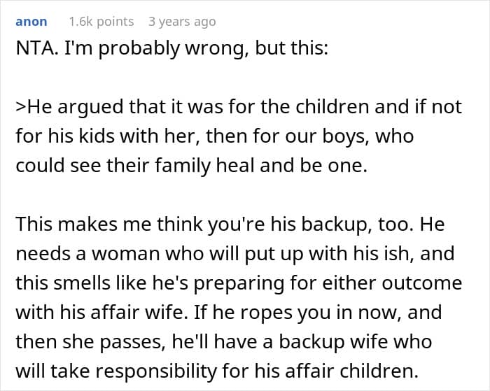 The ex-husband married the affair partner, had two children, and later faced a family crisis when his wife became seriously ill