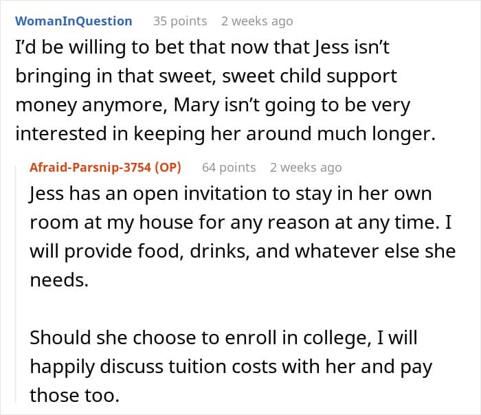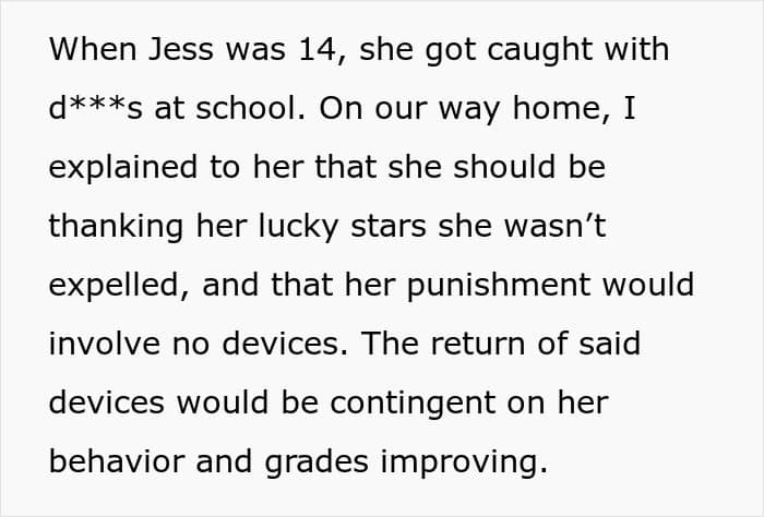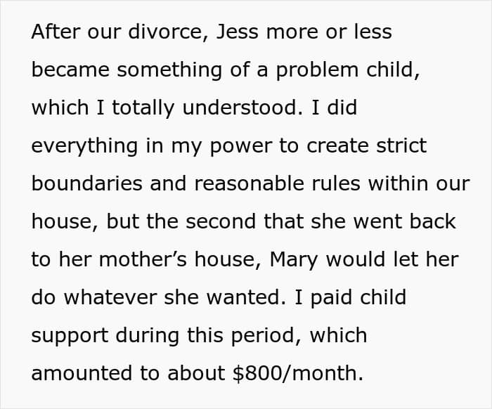 Post-divorce, things got rocky with Jess. The OP tried the whole “strict but fair” parenting approach, while Mary went for the “do-what-you-want” style. Guess which house Jess preferred? Hint: not the one with actual rules. I get it—as teens, we dream of a no-rule household, but that doesn’t mean it’s what’s best for the kid. And Jess is proof of that.