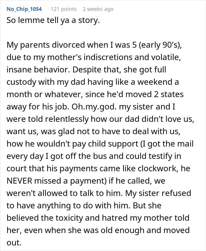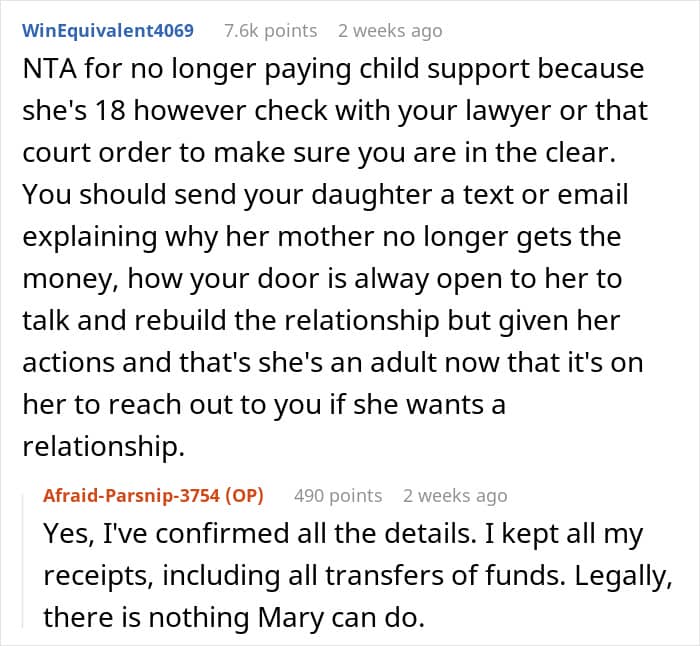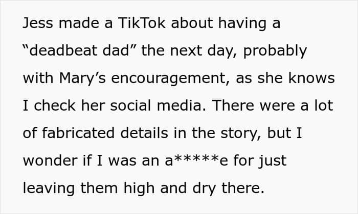 So, when Jess turned 18, the OP stopped paying child support. Legally, his obligations were over. But according to Mary, cutting off the cash flow was “abandonment.” And, as if things couldn’t get more heated, Jess took to TikTok, where all modern grievances are aired, to declare her dad a “deadbeat” with plenty of “creative” details about him, apparently at Mom’s suggestion.