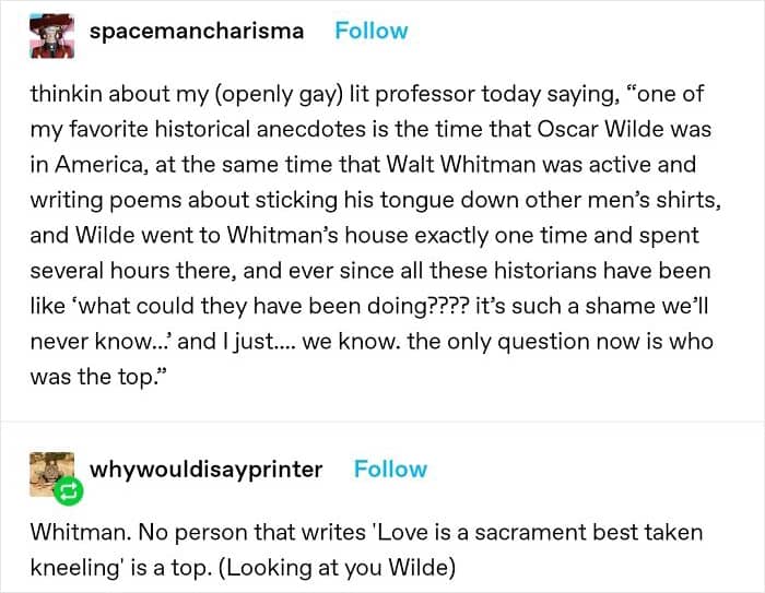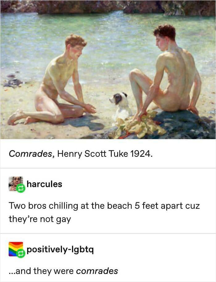 And thanks to the wonderfully colorful corner of reddit “Sappho And Her Friend,” “a sub dedicated to historical and other LGBTQ erasure from academia and other spaces,” we have the cringiest collection of such delusional examples.