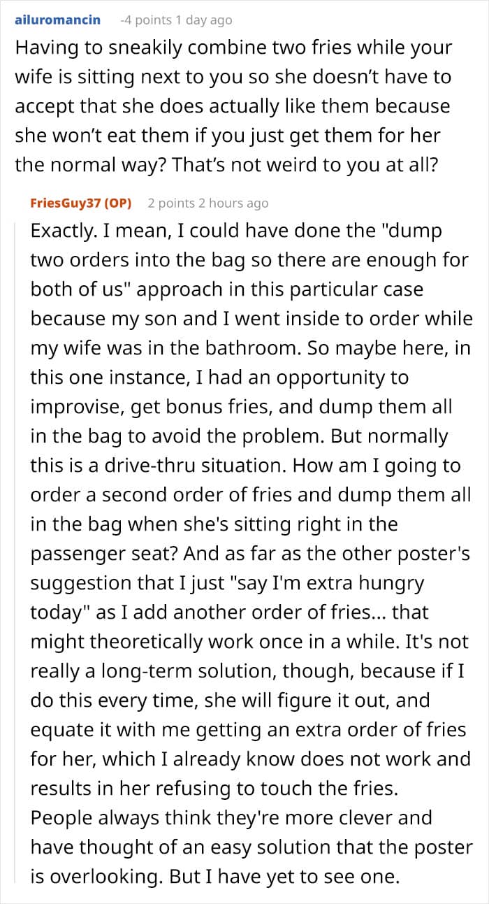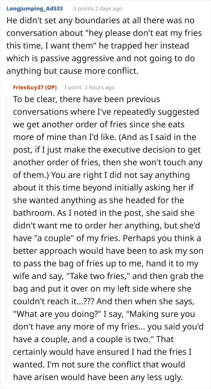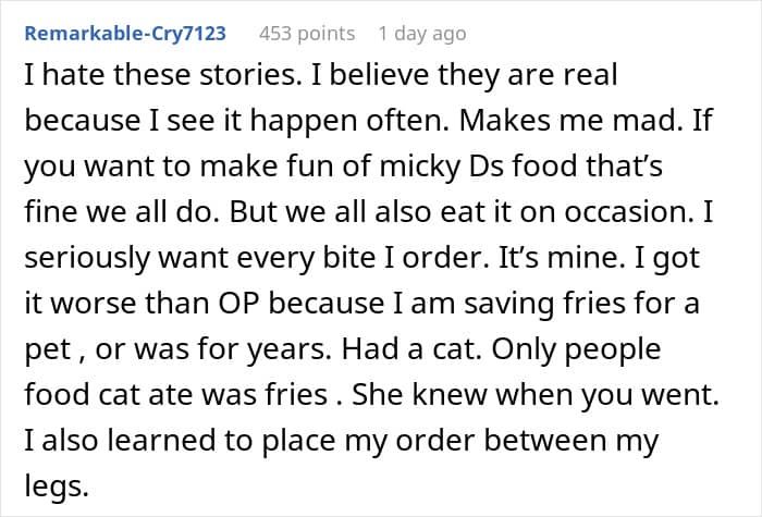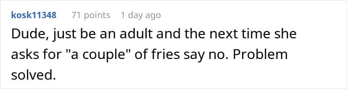 Of course, people have more complex feelings than animals when it comes to food, so it might be a good idea to be more understanding when someone doesn’t have the same attitude about sharing food as you do. Some people don’t like to share food for various reasons, so the best way to avoid food drama next time you go to order something is probably to simply get extra fries.
