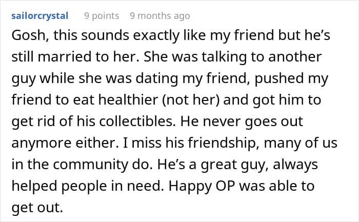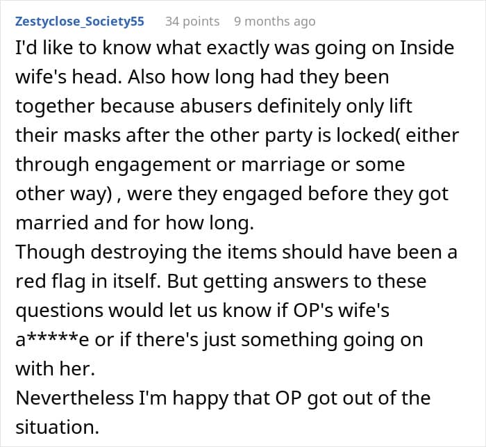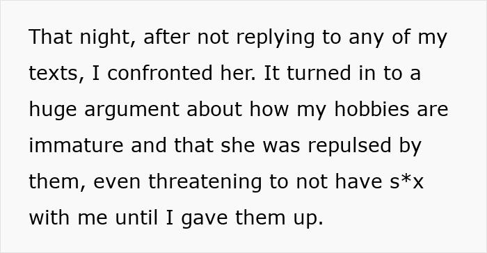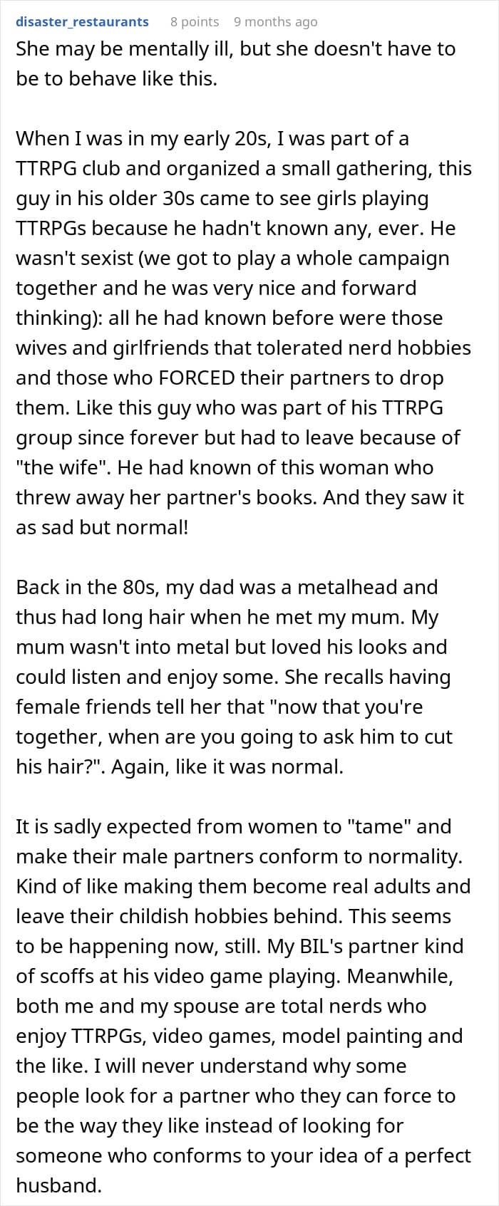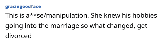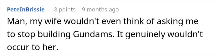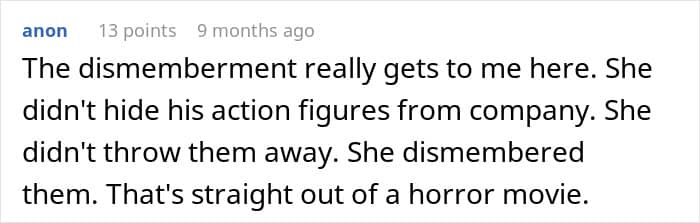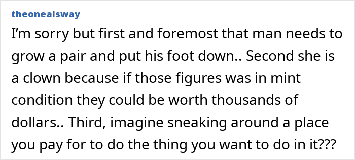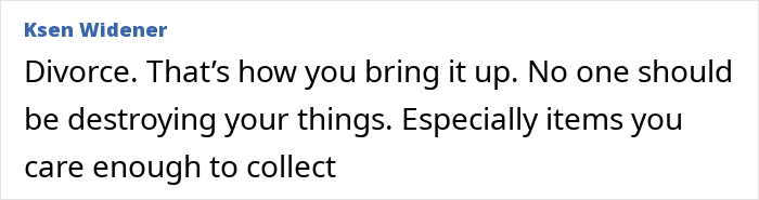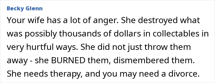 But his new wife thinks his hobbies are “immature” and “unhealthy,” so she burned his collectables
