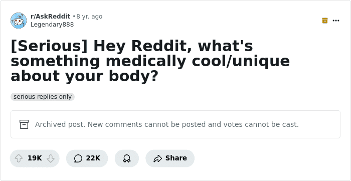 The selection we present to you today is based on this viral, albeit, quite old thread from the AskReddit community, where the user u/Legendary888 once asked: “What’s something medically cool/unique about your body?” In full accordance with the username of the thread starter, it turned out to be legendary, eventually gaining over 19K upvotes and 22K different comments.