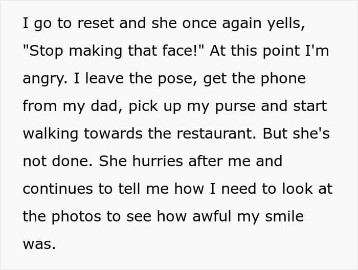 After being criticized about her smile, she decided she didn’t want to be in the pictures anymore; however, that wasn’t the end. The OP’s mom followed her, justifying herself and insisting that her smile had indeed been awful.