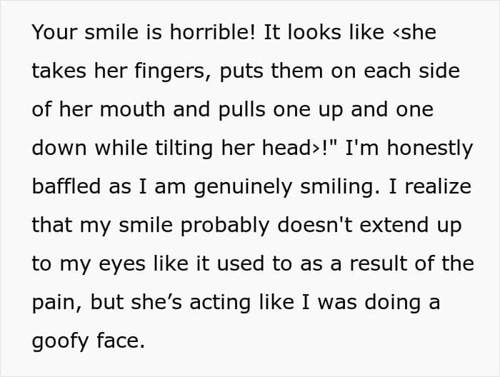But when she thought everything was fine, her mom spoke up, insisting that her smile was “horrible.” Rather than let the moment go, the mom made it worse, demonstrating how the OP’s face supposedly looked as if she was pulling her own face into exaggerated expressions.
