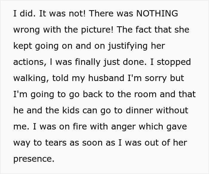 The OP couldn’t take it anymore. She decided she was done with dinner as well and told her husband and kids that she was leaving before retreating to her room in tears. She felt guilty for ruining the family dinner, but after everything—her pain, her mom’s constant undermining—she was emotionally drained.