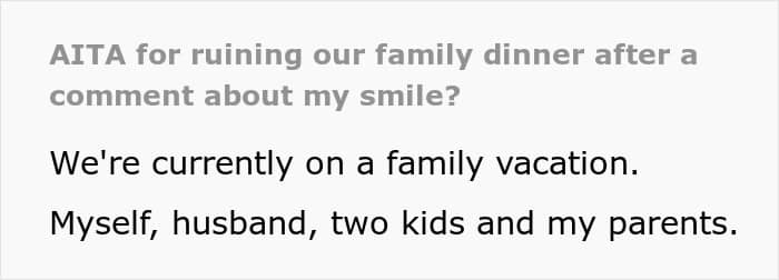At a family dinner, she posed for a picture with her husband and kids, but the author’s mother began to make comments about her smile being awful