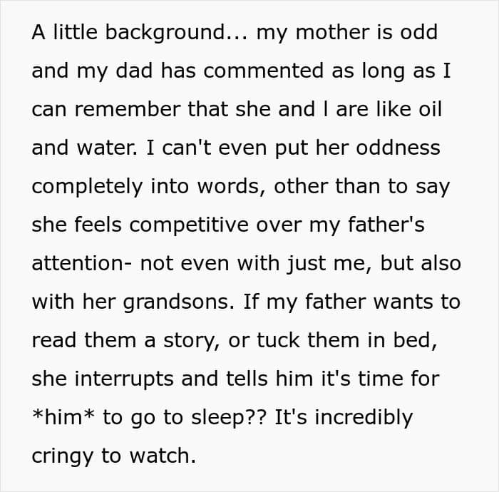 The OP set the stage; she was on vacation with her husband, kids, and parents. However, she also provided some context by sharing that she and her mom have a weird dynamic, with her dad noting they are “like oil and water”.