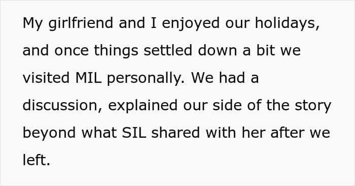 Eventually, the women decided to clear the air with everyone involved, and that’s why they finally shared their point of view. Luckily, the poster’s future mom-in-law took their side and apologized for her actions. Despite this reconciliation, the sister-in-law still kept being mean to the couple, and even went so far as to spread rumors about them.