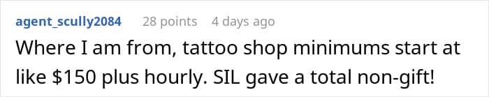 It’s clear that the sister-in-law thought that her gift would go over splendidly since the poster was heavily tattooed, so she was shocked when her present was rejected. Then, instead of accepting the OP’s decision and moving on, she blocked the woman and began spreading rumors about the couple.